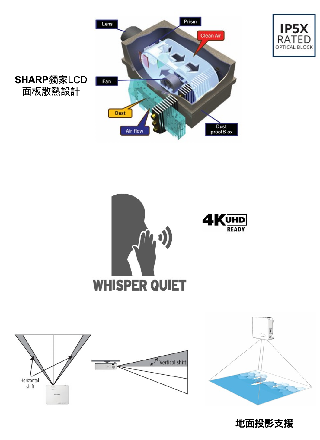 - 封閉式LCD散熱系統可防止灰塵進入光學元件,且無需濾網。